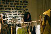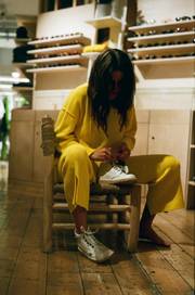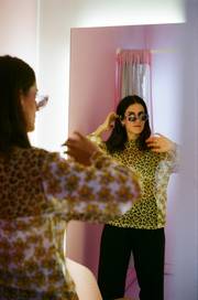 Trying on this yellow outfit in the store. it's the knitted one with the cuts that go up and they're like yellow knitted trousers - also the yellow knitted top. I'm going to buy it. I can't remember which brand it is (Baserange) but it's so nice. It's very sixties. I know it sounds a bit superficial because it's clothes, but clothes make me feel really happy. It's a creative thing I think.